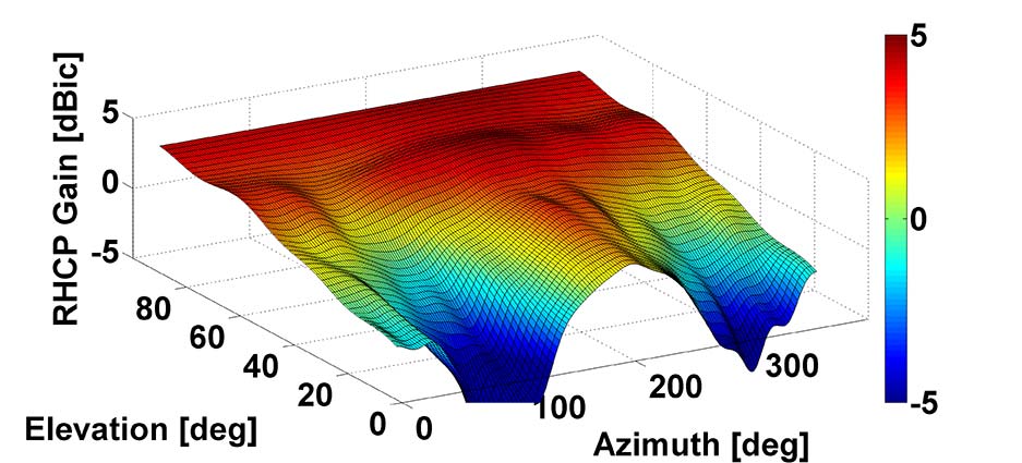 Figure 1a. 3D RHCP patterns at f=1575 MHz for single-feed antenna. Source: Stefano Caizzone, Mihaela-Simona Circiu, Wahid Elmarissi, Christoph Enneking, Michael Felux and Kazeem A. Yinusa, German Aerospace Center (DLR)