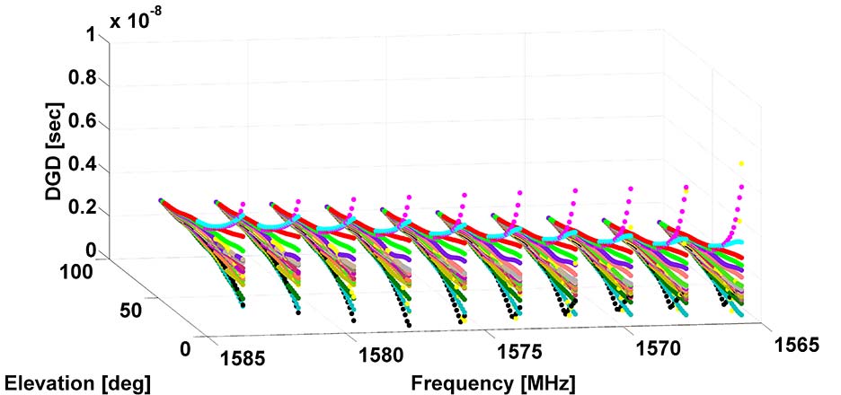 Figure 4a. Differential group delay versus elevation angle and frequency (each color represents an azimuth value) for single-feed antenna. Source: Stefano Caizzone, Mihaela-Simona Circiu, Wahid Elmarissi, Christoph Enneking, Michael Felux and Kazeem A. Yinusa, German Aerospace Center (DLR)