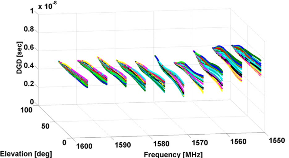 Figure 6a. Differential group delay versus elevation angle and frequency (each color represents an azimuth value) as from measurement for a badly polarized COTS antenna. Source: Stefano Caizzone, Mihaela-Simona Circiu, Wahid Elmarissi, Christoph Enneking, Michael Felux and Kazeem A. Yinusa, German Aerospace Center (DLR)