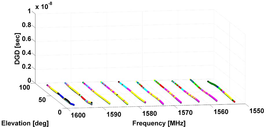 Figure 6c. Differential group delay versus elevation angle and frequency (each color represents an azimuth value) as from measurement for a DLR four-feed antenna. Source: Stefano Caizzone, Mihaela-Simona Circiu, Wahid Elmarissi, Christoph Enneking, Michael Felux and Kazeem A. Yinusa, German Aerospace Center (DLR)
