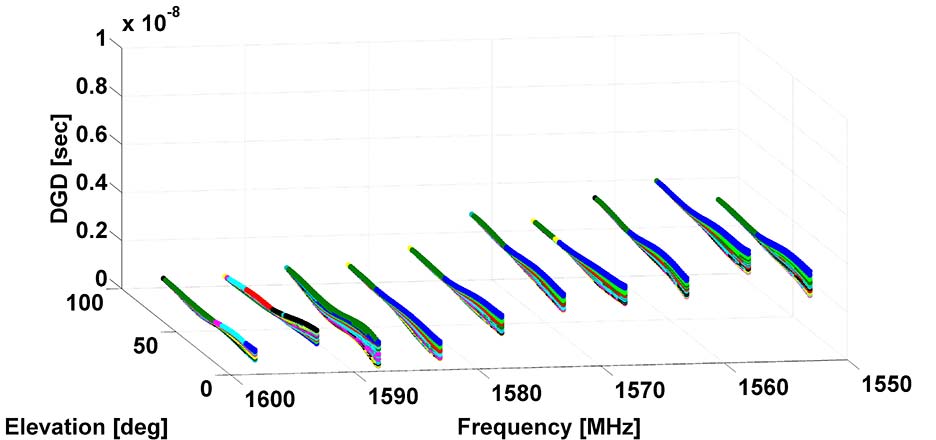 Figure 6b. Differential group delay versus elevation angle and frequency (each color represents an azimuth value) as from measurement for a DLR dual-feed antenna. Source: Stefano Caizzone, Mihaela-Simona Circiu, Wahid Elmarissi, Christoph Enneking, Michael Felux and Kazeem A. Yinusa, German Aerospace Center (DLR)