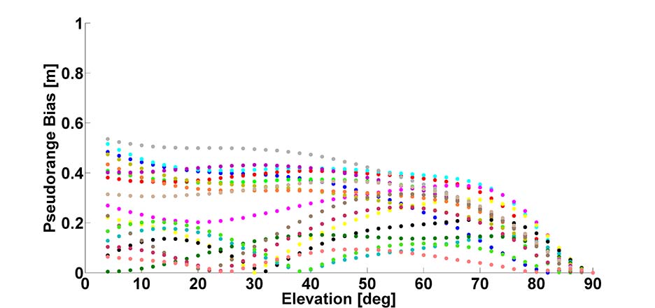 Figure 7a. Pseudorange bias versus elevation angle (each color represents an azimuth value) at L1 band for badly polarized COTS antenna. Source: Stefano Caizzone, Mihaela-Simona Circiu, Wahid Elmarissi, Christoph Enneking, Michael Felux and Kazeem A. Yinusa, German Aerospace Center (DLR)
