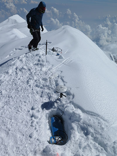 The summit team arrived at the top of North America’s highest peak around 3:15 p.m. on June 24. Their first task was to identify the true summit. A small diamond of snow was prominent near the south-face cliff edge and was identified as the highest point of the mountain. A range pole was driven into the snow near the true summit, leveled with the summit, and GPS equipment was installed and powered on.