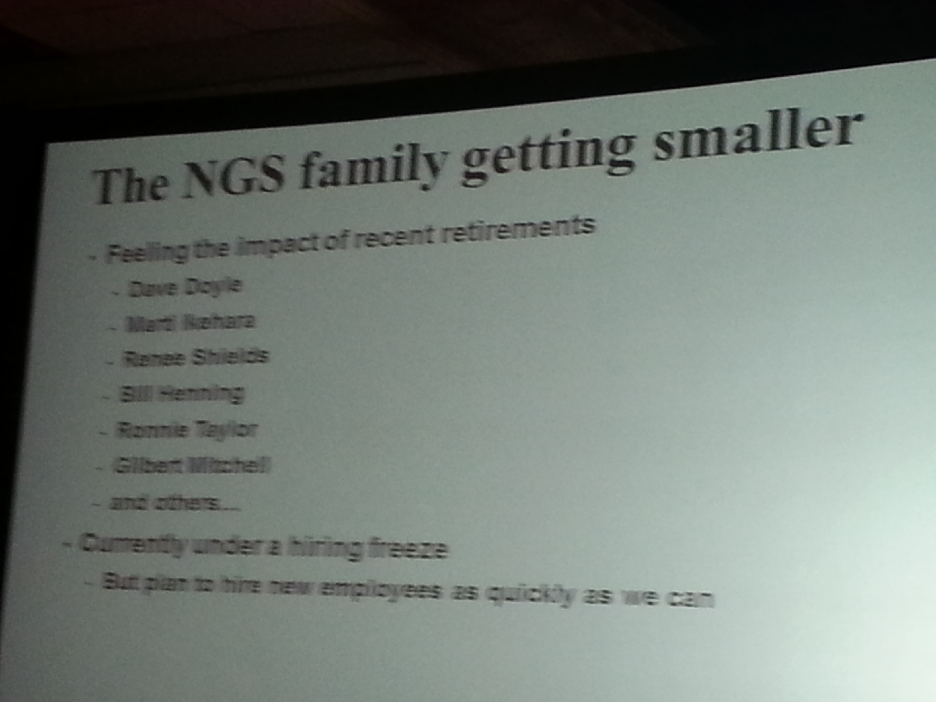 • National Geodetic Survey (NGS) usually sends a pack of people to the conference. This year, it all fell on Michael Dennis, who delivered a record number of presentations. The NGS is getting smaller. It employs about one third of the people it used to. People with a tremendous amount of knowledge and outreach throughout the years such as Dave Doyle and Bill Henning have retired recently, and there’s a hiring freeze at NGS. While geodesy for GIS is becoming more important, we are losing geodesy expertise at the federal level.