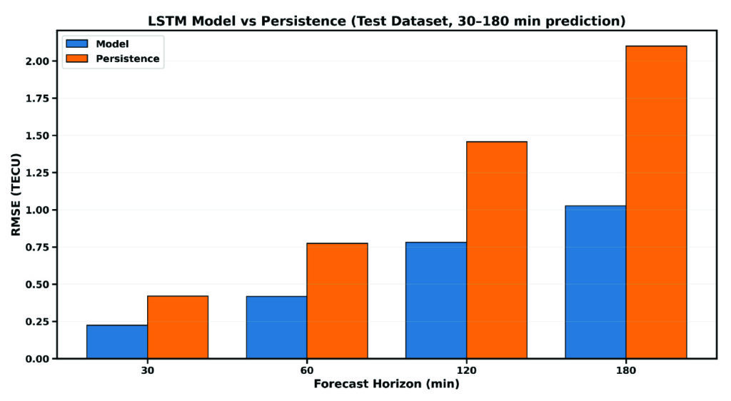 For practical assessment, the LSTM-based predictions are evaluated against commonly used baseline models, including persistence (using the trained model with new data) and skill (the ability of the model to make predictions). These baselines represent the minimum performance expected in operational GNSS ionospheric modeling and serves as internal validation of the overall model’s performance. Evaluation metrics include, but are not limited to, root mean square error (RMSE), mean absolute error (MAE), and relative improvement over persistence (skill). Figure 3 compares the predictive performance of the proposed LSTM model against the persistence baseline on the independent dataset. RMSE increases over time, while persistence largely deviates from the LSTM model, showing the great strength and capability of the LSTM model for time series prediction over the Santa Maria station. For instance, the RMSE of the LSTM model increases from 0.24 TECU to 1.15 TECU from 30 minutes to 3 hours lead time, while that of persistence ranges from 0.41 TECU to 2.25 TECU, respectively.