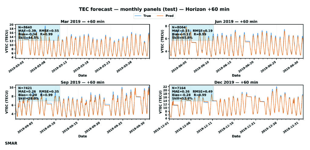 Error increases toward December with the largest RMSE in March (0.549 TECU). September shows moderate error levels. Also, correlation is consistent across all months, which confirms the model’s capability to capture TEC changes and day-to-day variability patterns. The model is nearly unbiased as the bias is consistently close to zero, meaning that the LSTM does not drift systematically and shows that the model underpredicts GPS VTEC. This characteristic is important for operational GNSS corrections, because biased VTEC forecasts would translate to persistence positioning errors. Going by the skill values, even at 60 minutes forecast, the model provides ~27%-52% improvement over persistence. This result implies a major indicator of real predictive ability, especially for GNSS applications.