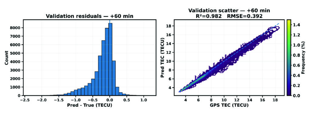 FIGURE 5 Validation diagnostics at 60 minutes forecast horizon. (Left) Histogram of prediction residuals. (Right) Density scatter of predicted versus observed TEC.