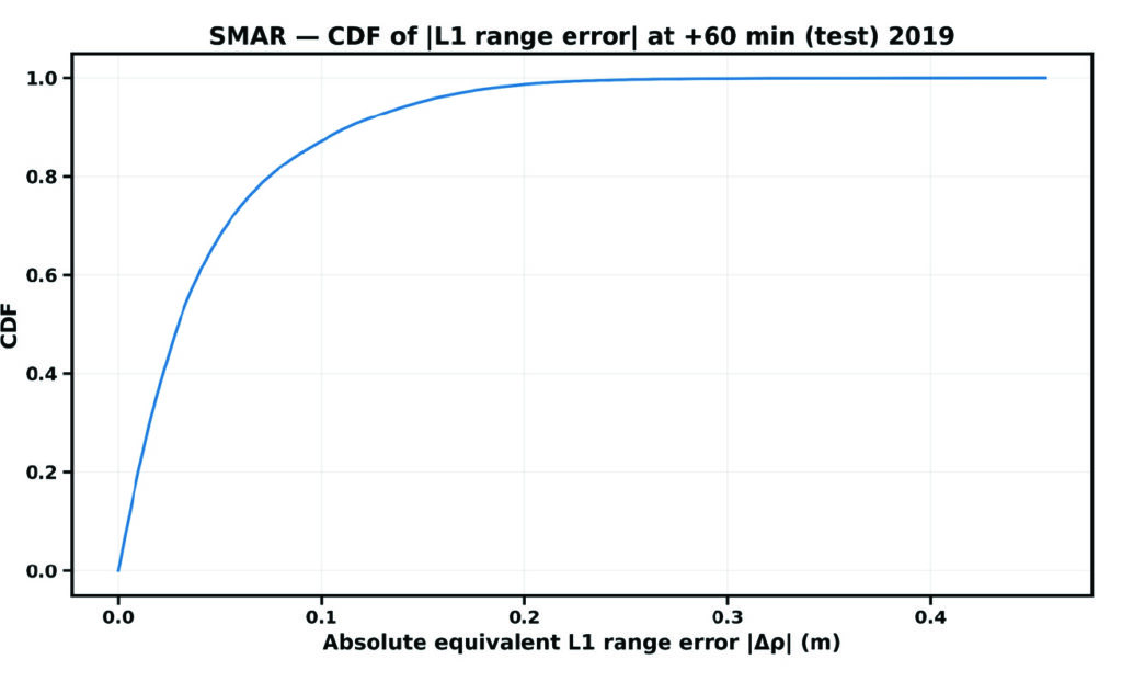 The CDF provides a direct positioning-relevant interpretation of model performance. The steep rise at small error values indicates that most samples exhibit low residual range errors, demonstrating strong correlation performance.