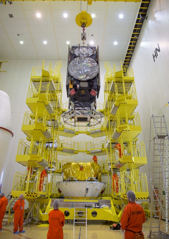 Galileos 9 and 10 are lowered onto the Fregat upper stage. (Credit: CNES/ESA)