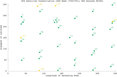 Constellation snapshot for a specific date/time: GPS week 1749 (725) and GPS seconds 86400 = July 15, 2013, at midnight GPS Time.