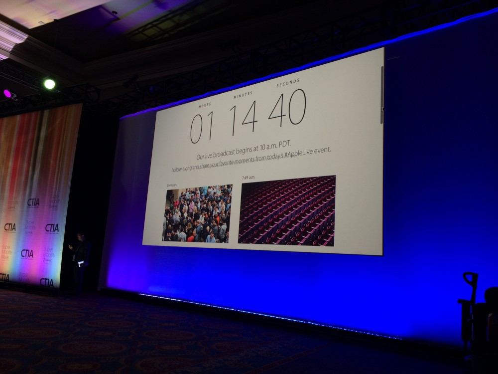 A screen counts down to the Apple Live Event, an announcement that had the crowd abuzz.