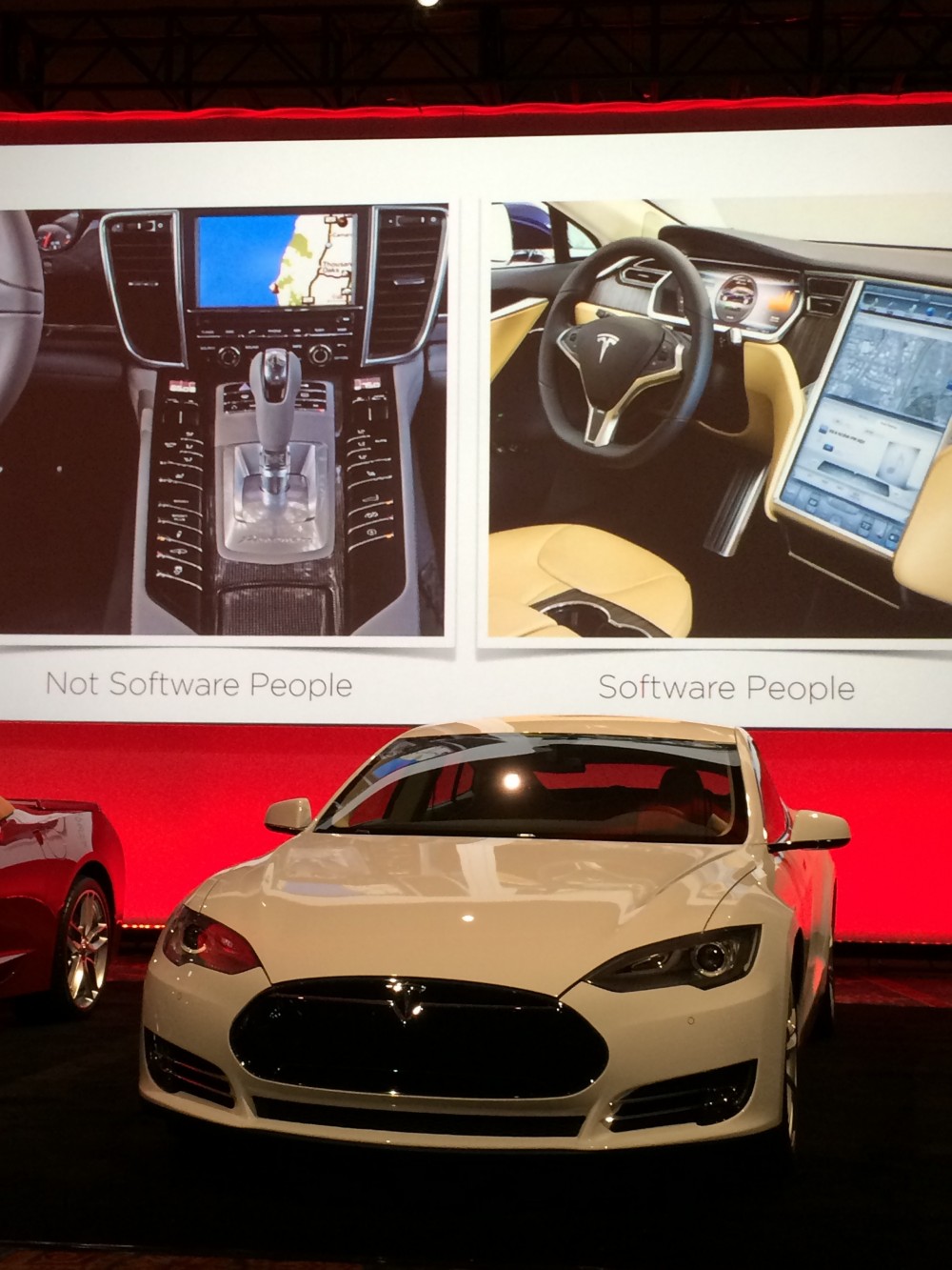 Jeff Lawson, CEO of Twilio, comparing "hardware people" and "software people," says Tesla's Model S interior forgoes extra buttons for useful, adaptable software. Photo: GPS World