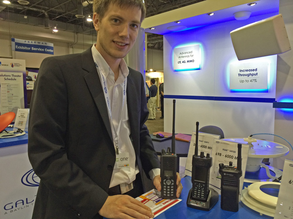 Tobias Eger, product marketing manager for Israel-based Galtronics, displays some of the company's GPS antennas. Photo: GPS World